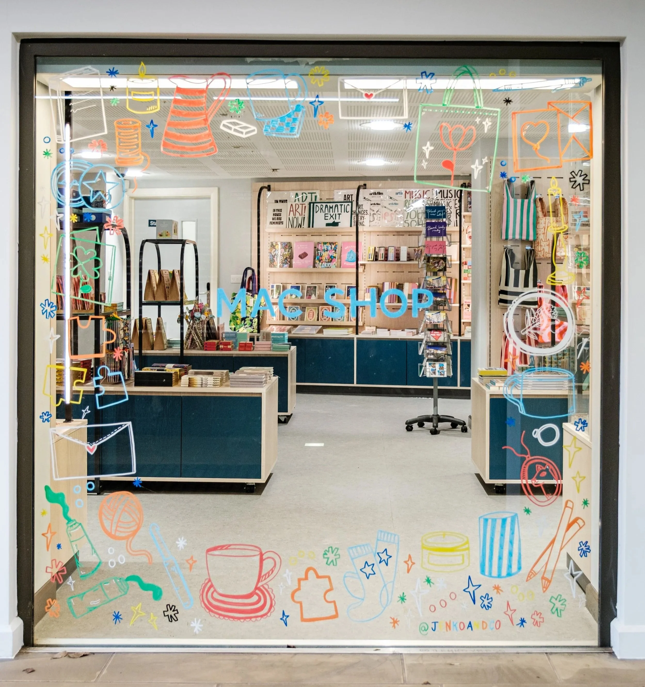 A recent window painting for Midlands Art Centre in Birmingham. This is an ongoing freelance position and will be regularly updated with seasonal designs. All designs are created digitally, then painted with acrylic paint and POSCA paint pens! The window pictured was used to celebrate their recent shop re-launch, and was received very positively by staff and attendees. Photography by Will Pace.